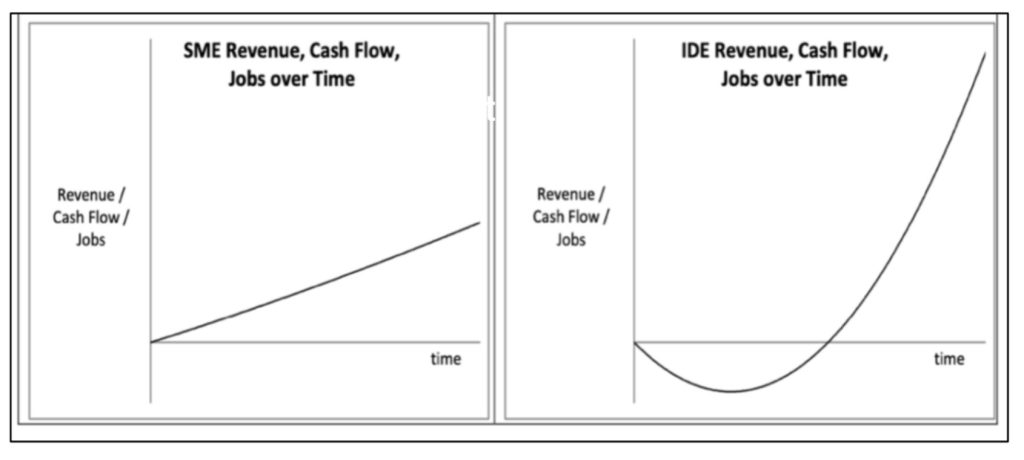 By contrast, IDE has a global focus from the start, and from the very beginning they are focused on how to grow big and make a big impact. They are focused more on international markets. There is more money, more risk and more complexity in IDEs. Because IDEs are innovation driven, there is generally a period of negative cash flow and revenue as they invest before things take off exponentially over time.